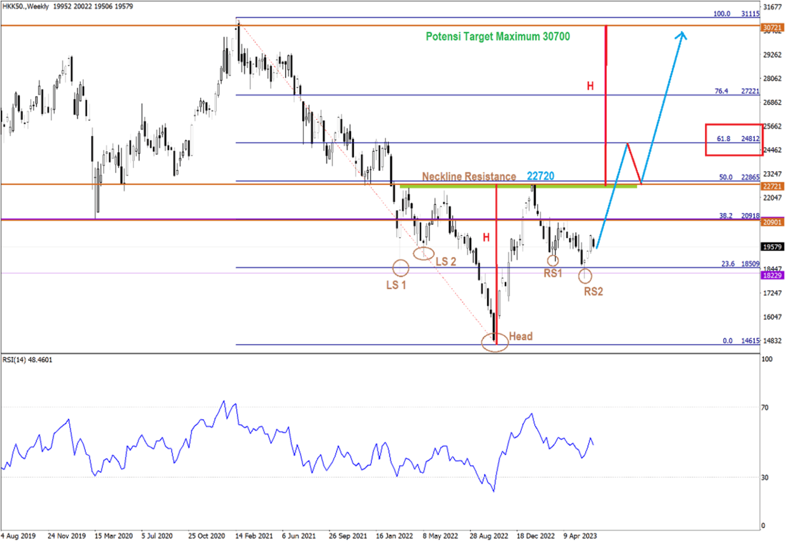 Hang Seng berhasil rebound bertahap sejak sentuh level terendah 14615. Sempat tertahan di level tertinggi pantulan 22720, kemudian koreksi turun pun cenderung bertahan di kisaran 18842 (RS1) dan 17961 (RS2). Dan saat ini berada di level 18500 (penutupan per 23 Juni 2023). Secara bertahap, resistance akan berpotensi menghalangi di kisaran 20918 (FR 38.2% Weekly), 21724 (low 27 Februari 2022), dan 22742 (neckline, high 29 Januari 2023).
