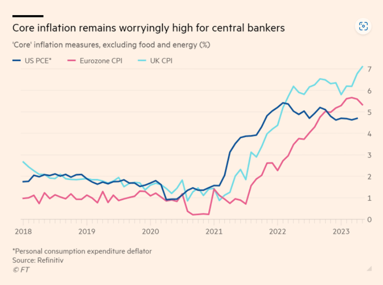 Semua data menunjukkan kebalikan dari ekspektasi inflasi turun setelah kenaikan suku bunga dalam 2 tahun terakhir. Sebagai perbandingan inflasi di AS yang saat ini 4% dan di Jerman 6.3%. Meskipun sudah turun dari level tertingginya 11.1% di bulan Oktober lalu, ini menempatkan Inggris dengan inflasi tertinggi di antara negara-negara G7. Angka inflasi di negara maju lainnya masih mengkhawatirkan dengan potensi untuk kembali naik seiring belum stabilnya harga minyak dunia karena perang Ukraina – Rusia yang berkepanjangan dan dampaknya terhadap stabilitas ekonomi global. Kenaikan inflasi lebih dirasakan di sektor jasa di mana terjadi lonjakan aktifitas ekonomi setelah dibukanya kembali akses keluar masuk paska berakhirnya pembatasan akibat pandemi Covid 19. Kenaikan suku bunga acuan bank sentral belum sepenuhnya menurunkan inflasi seperti yang diharapkan. Ini menandakan bahwa bank sentral belum sepenuhnya dapat mengendalikan inflasi.