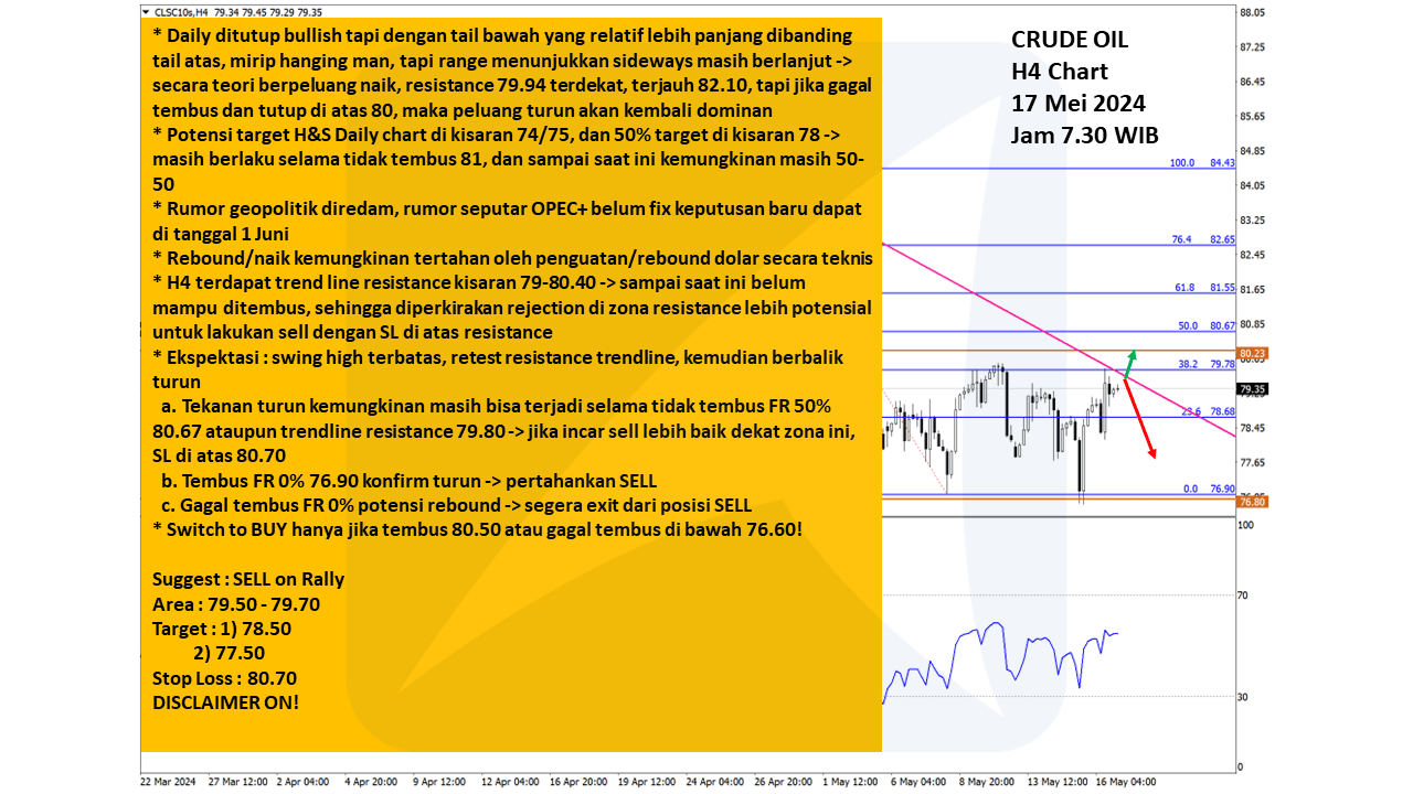 - Potensi target H&S Daily chart di kisaran 74/75, dan 50% target di kisaran 78 -> masih berlaku selama tidak tembus 81, dan sampai saat ini kemungkinan masih 50-50