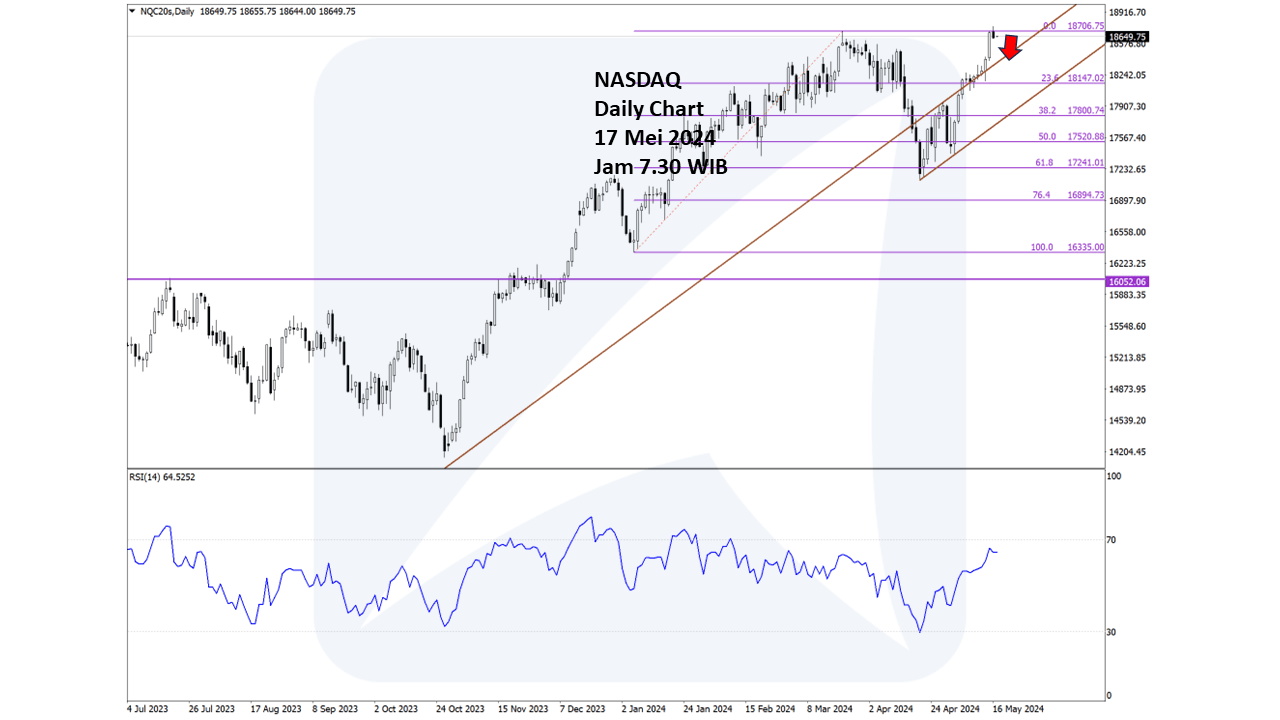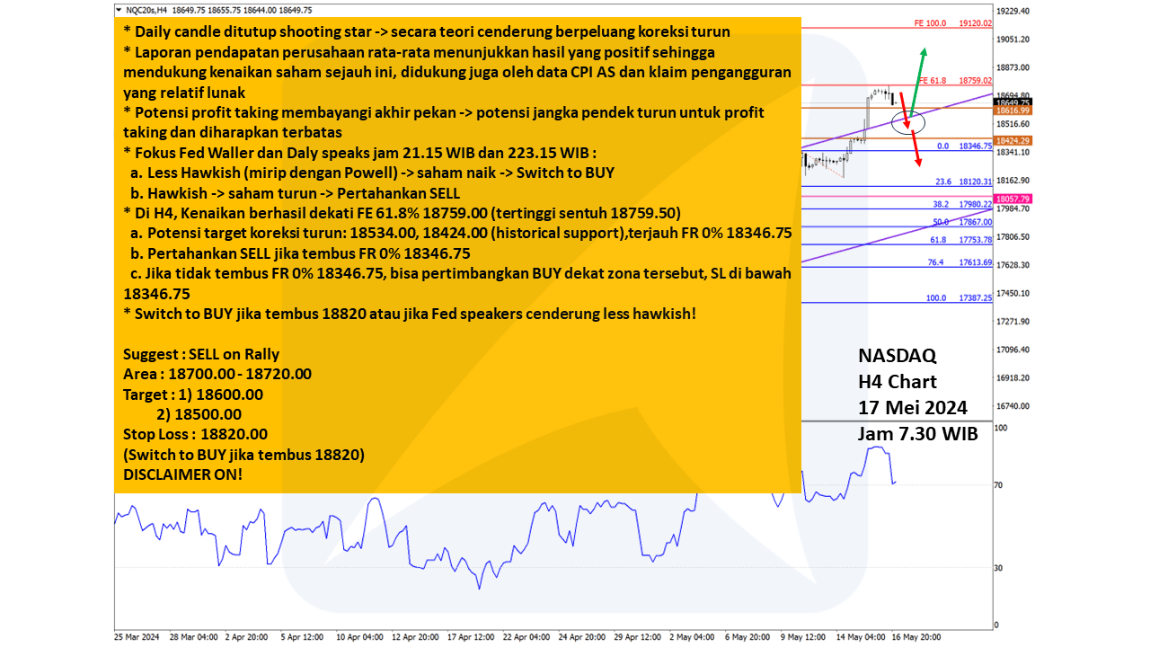 b. Hawkish -> saham turun -> Pertahankan SELL - Di H4, Kenaikan berhasil dekati FE 61.8% 18759.00 (tertinggi sentuh 18759.50)
