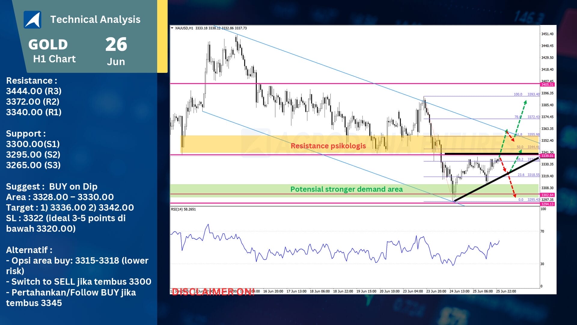 | Suggest : BUY on Dip Area : 3328.00 – 3330.00 Target : 1) 3336.00 2) 3342.00 SL : 3322 (ideal 3-5 points di bawah 3320.00) Alternatif : Opsi area buy: 3315-3318 (lower risk) Switch to SELL jika tembus 3300 Pertahankan/Follow BUY jika tembus 3345 |