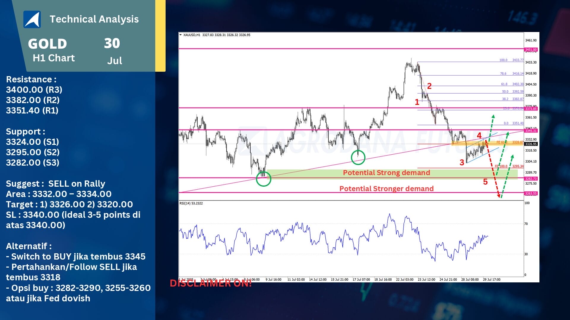 Alternatif lain, area 3255-3260 bisa juga menjadi pertimbangan area buy jika terjadi penurunan di bawah 3280, dengan asumsi bahwa data ekonomi dirilis lebih baik dari ekspektasi, dan dukungan rebound baru bisa didapatkan setelah pidato Powell yang dovish (syarat mutlak untuk rebound yang kuat).