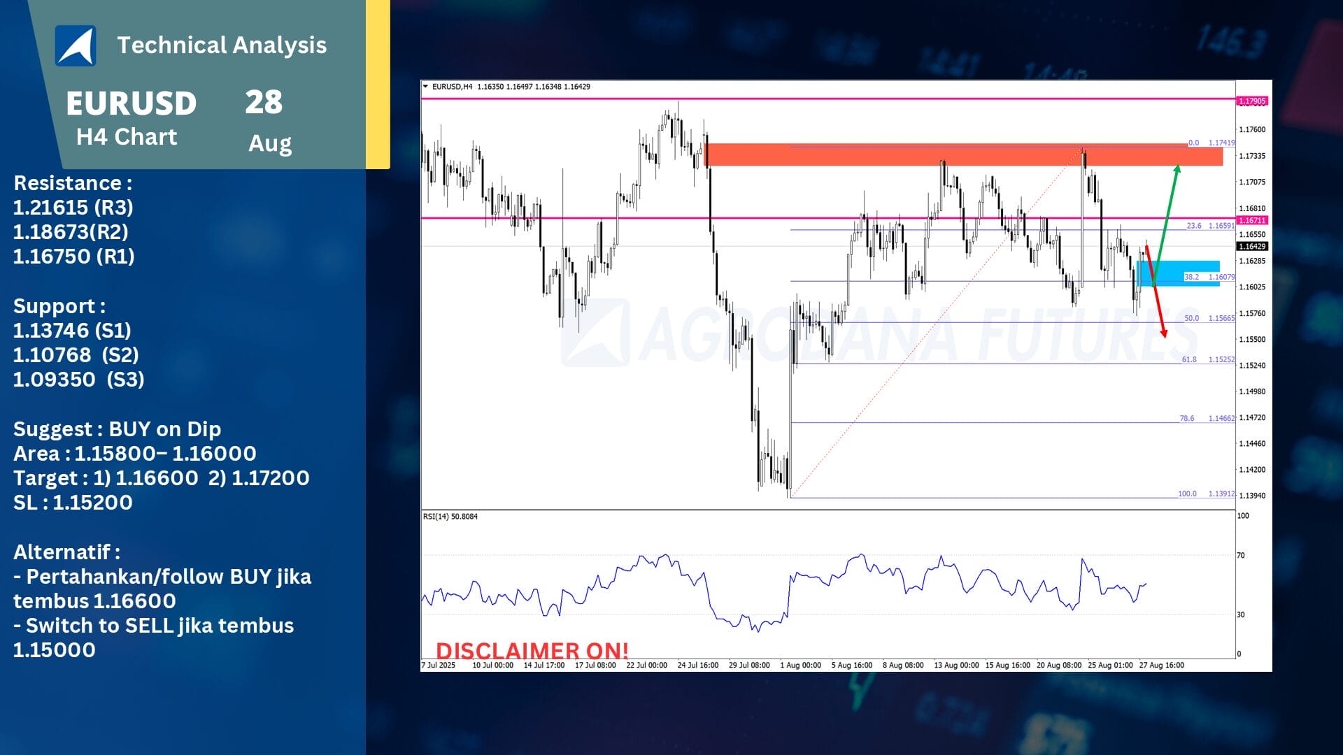 | Suggest : BUY on Dip Area : 1.15800– 1.16000 Target : 1) 1.16600 2) 1.17200 SL : 1.15200 Alternatif : - Pertahankan/follow BUY jika tembus 1.16600 - Switch to SELL jika tembus 1.15000 |