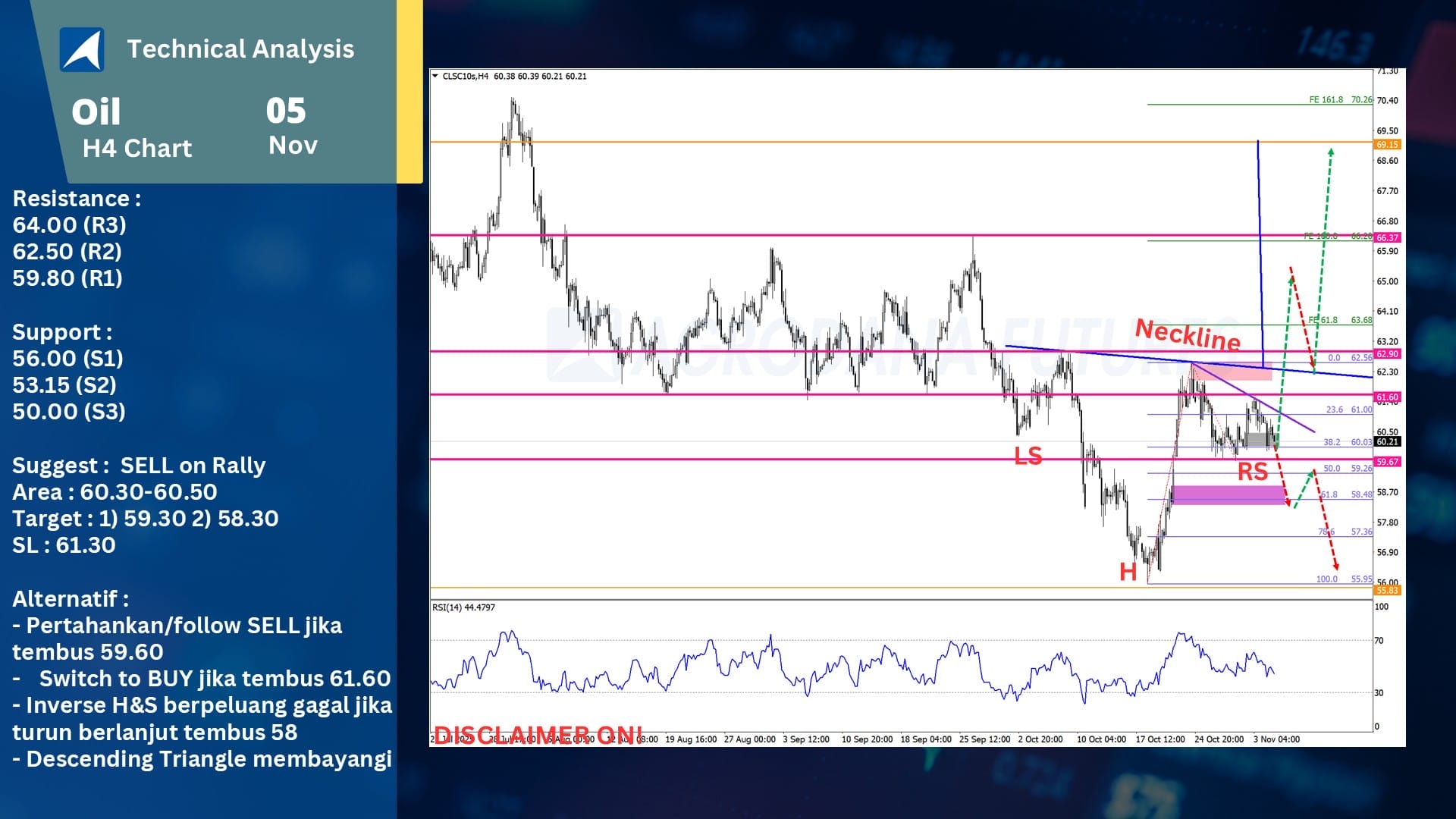 | Suggest : SELL on Rally Area : 60.30-60.50 Target : 1) 59.30 2) 58.30 SL : 61.30 Alternatif : Pertahankan/follow SELL jika tembus 59.60 Switch to BUY jika tembus 61.60 Inverse H&S berpeluang gagal jika turun berlanjut tembus 58 Descending Triangle membayangi |