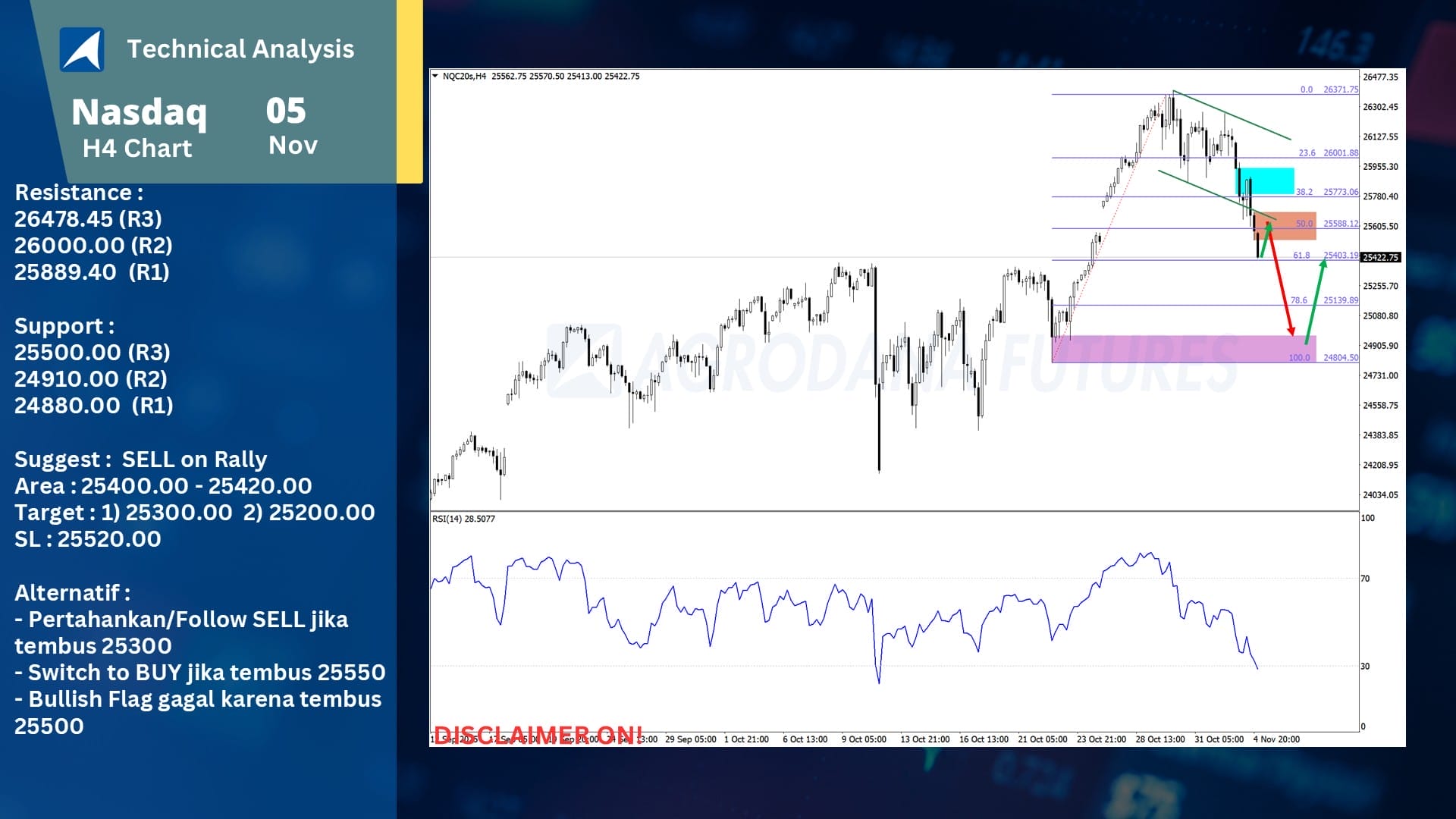| Suggest : SELL on Rally Area : 25400.00 - 25420.00 Target : 1) 25300.00 2) 25200.00 SL : 25520.00 Alternatif : Pertahankan/Follow SELL jika tembus 25300 Switch to BUY jika tembus 25550 Bullish Flag gagal karena tembus 25500 |