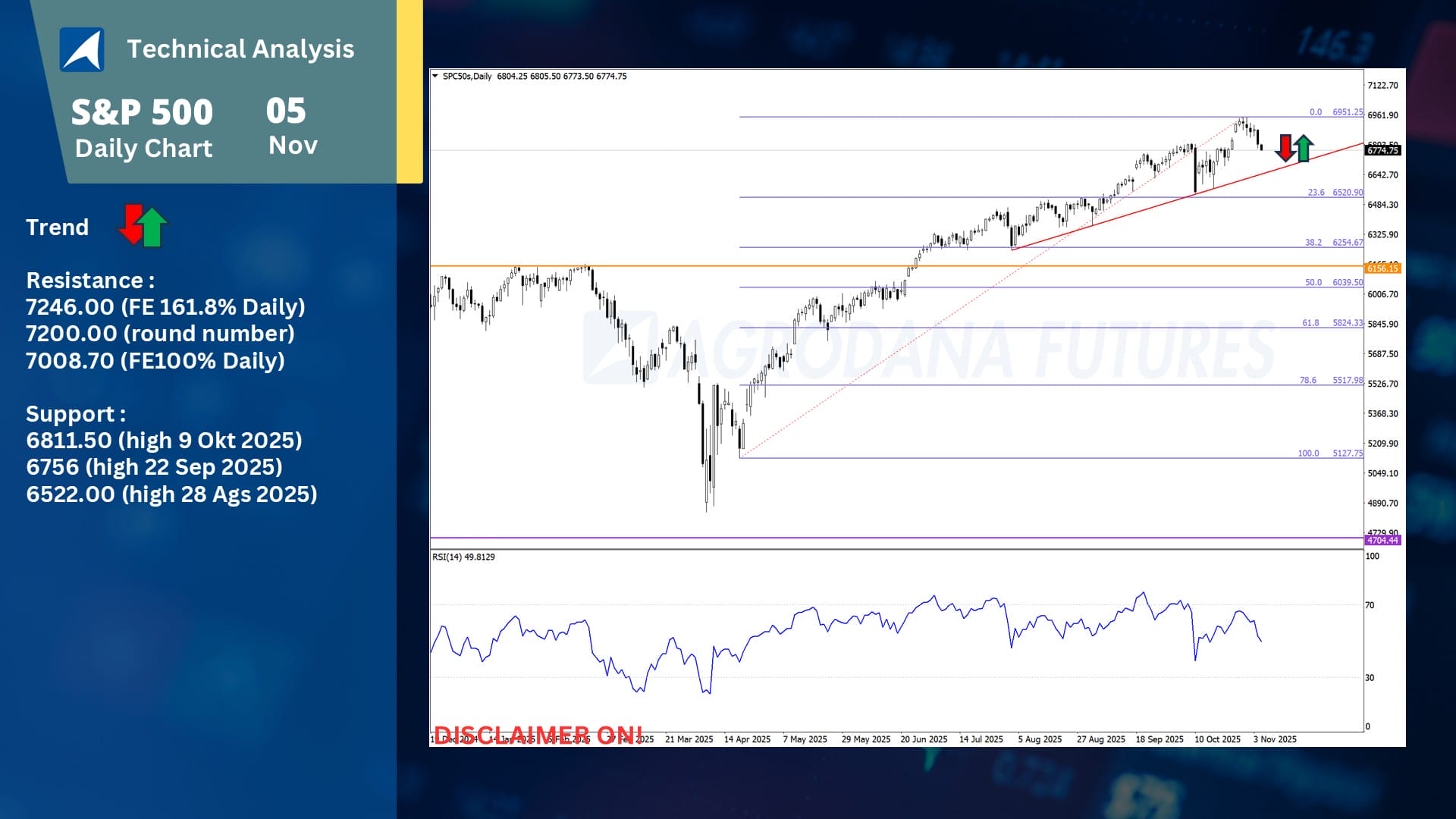 | Suggest : SELL on Rally Area : 6780.00 – 6790.00 Target : 1) 6750.00 2) 6720.00 SL : 6820.00 Alternatif : Pertahankan/follow SELL jika tembus 6760 Switch to BUY jika tembus 6850 Bullish gagal karena support 6800 ditembus |