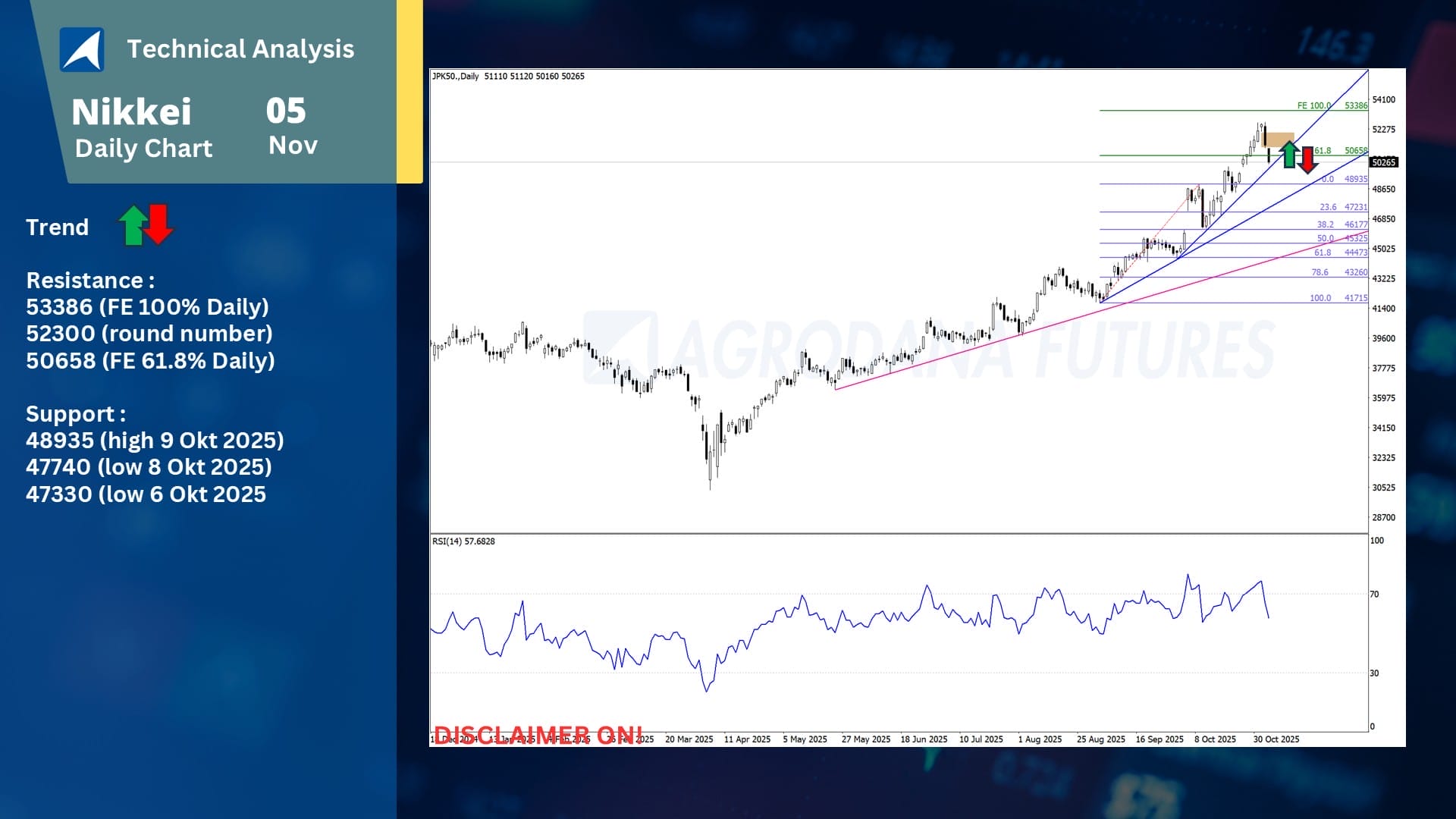 - Nikkei masih positif secara keselurugan karena ekspektasi kebijakan fiskal longgar dari pemerintahan Takaichi, penurunan diperkirakan karena koreksi atau profit taking yang juga dipicu dari koreksi tajam Wall Street