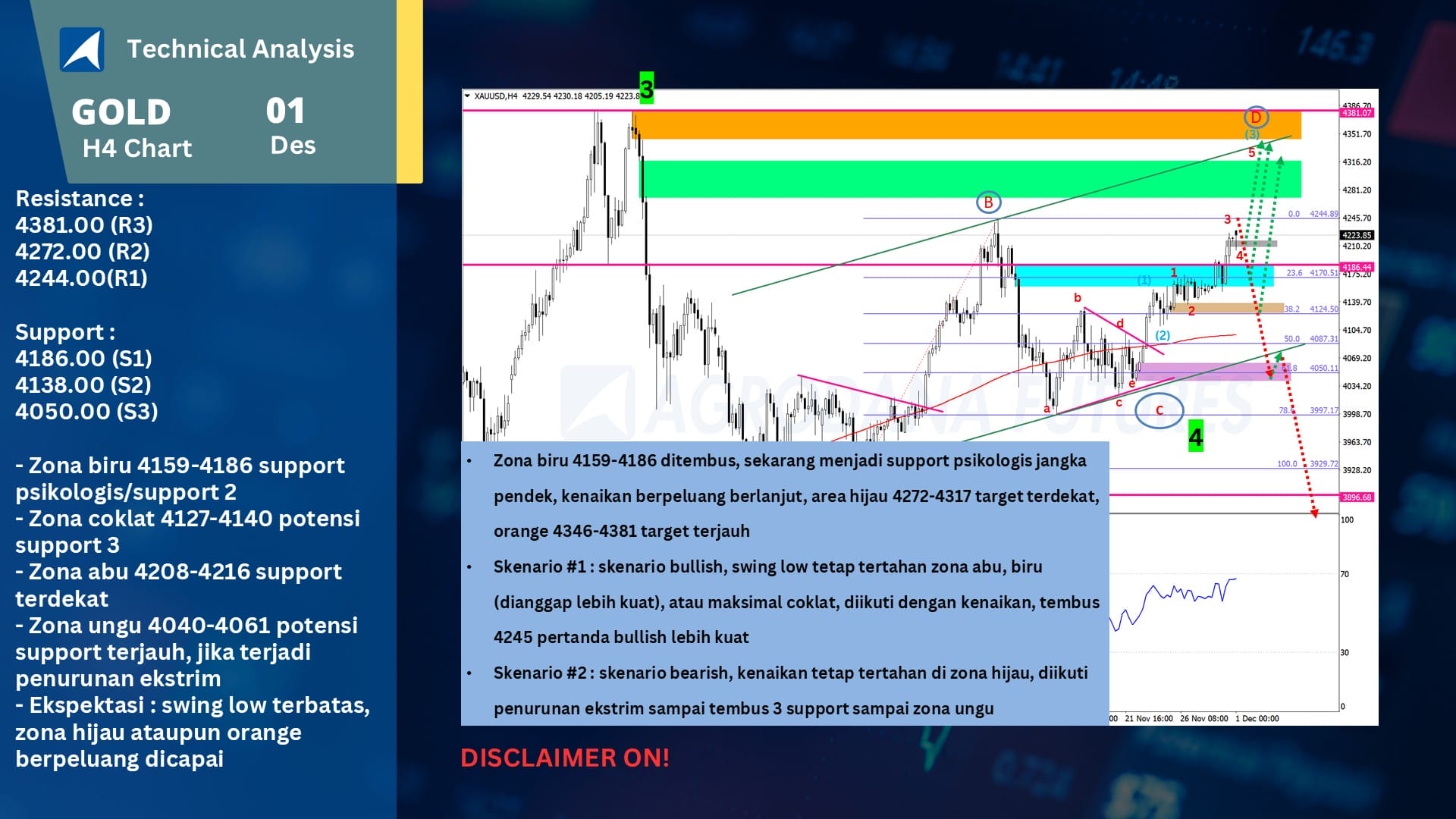 - a. Skenario #1 : skenario bullish, swing low tetap tertahan zona abu, biru (dianggap lebih kuat), atau maksimal coklat, diikuti dengan kenaikan, tembus 4245 pertanda bullish lebih kuat -> buy lebih dominan, zona biru dianggap demand yang lebih baik