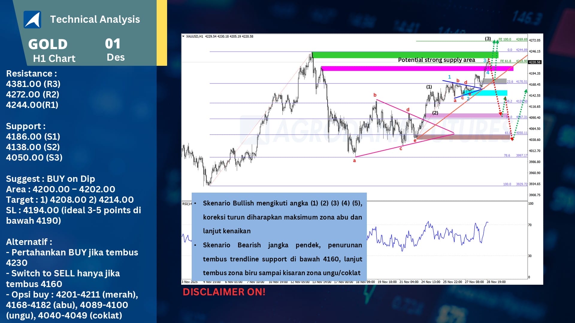 - a. skenario bullish berlanjut: swing low tertahan maksimal zona abu-abu 4168-4182 atau tetap di atas trendline support lanjut dengan kenaikan dan tembus zona hijau-> opsi buy bisa dilakukan zona merah 4201-4211 atau zona abu-abu 4168-4182, stop loss wajib digunakan!