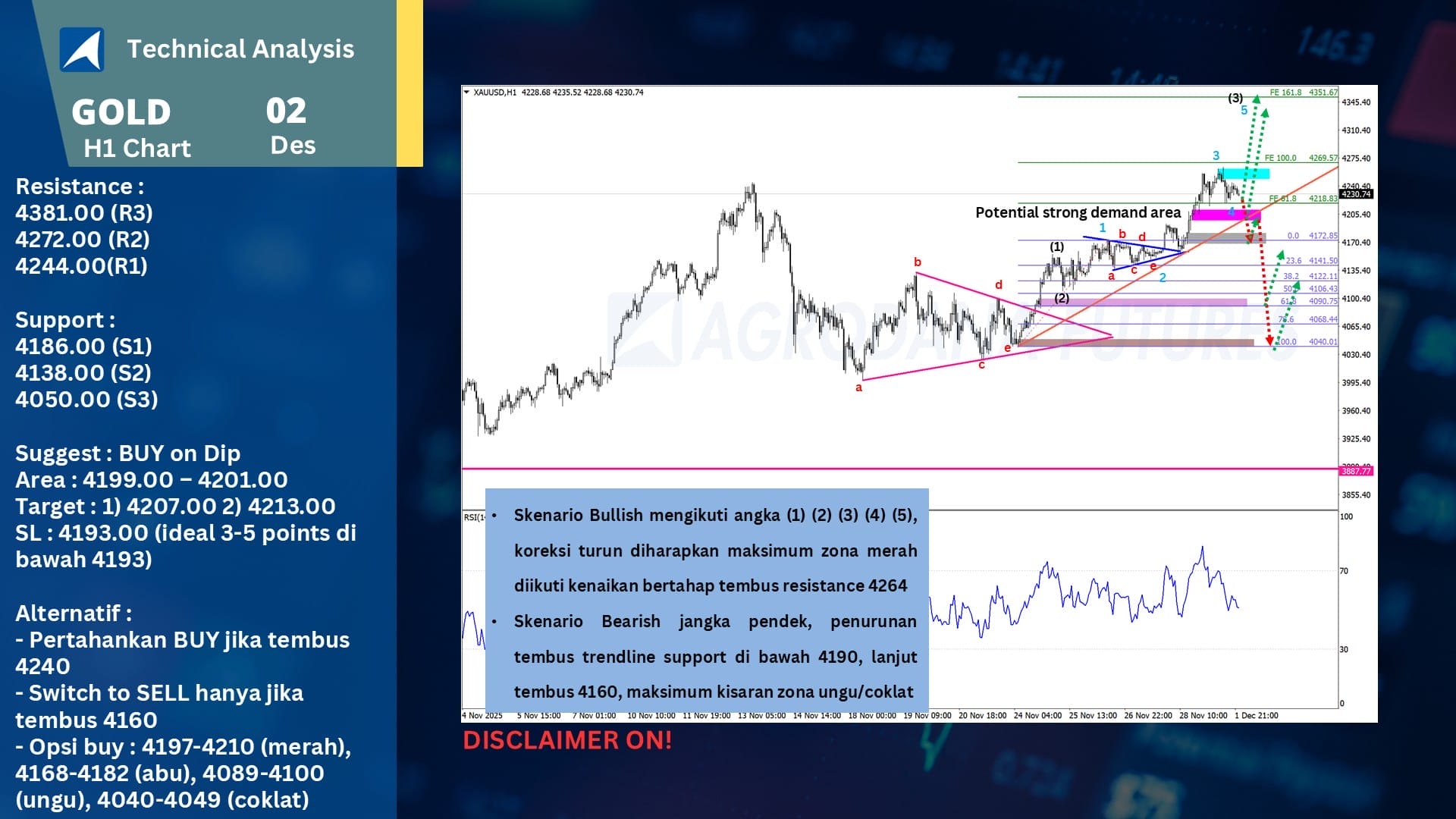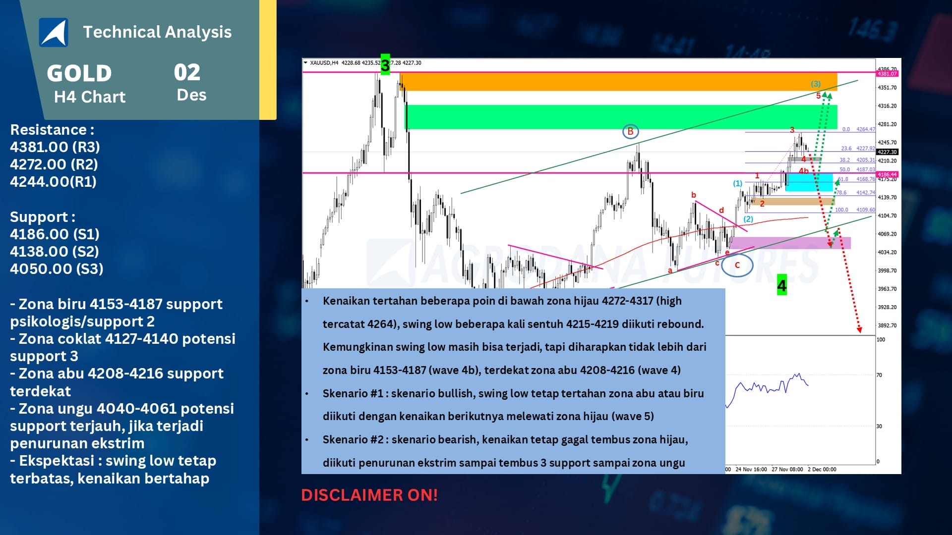 Skenario #1 (bullish), penurunan/swing low tetap tertahan maksimum zona biru, terdekat zona abu-abu. Buy bisa dilakukan di antara kedua zona tersebut. Lalu lanjutkan kenaikan ke zona hijau 4272-4317. Atau jika data ekonomi AS nanti malam dirilis lebih rendah, maka peluang berlanjut ke zona orange 4346-4381. Namun kami memperkirakan zona orange baru akan tercapai setelah data ADP dan ISM services yang dijadwalkan dirilis hari Rabu. Tapi jika terjadi kejutan dari data JOLTS malam ini, maka bisa saja muncul lebih cepat jika resistance-resistance di bawahnya berhasil ditembus.
