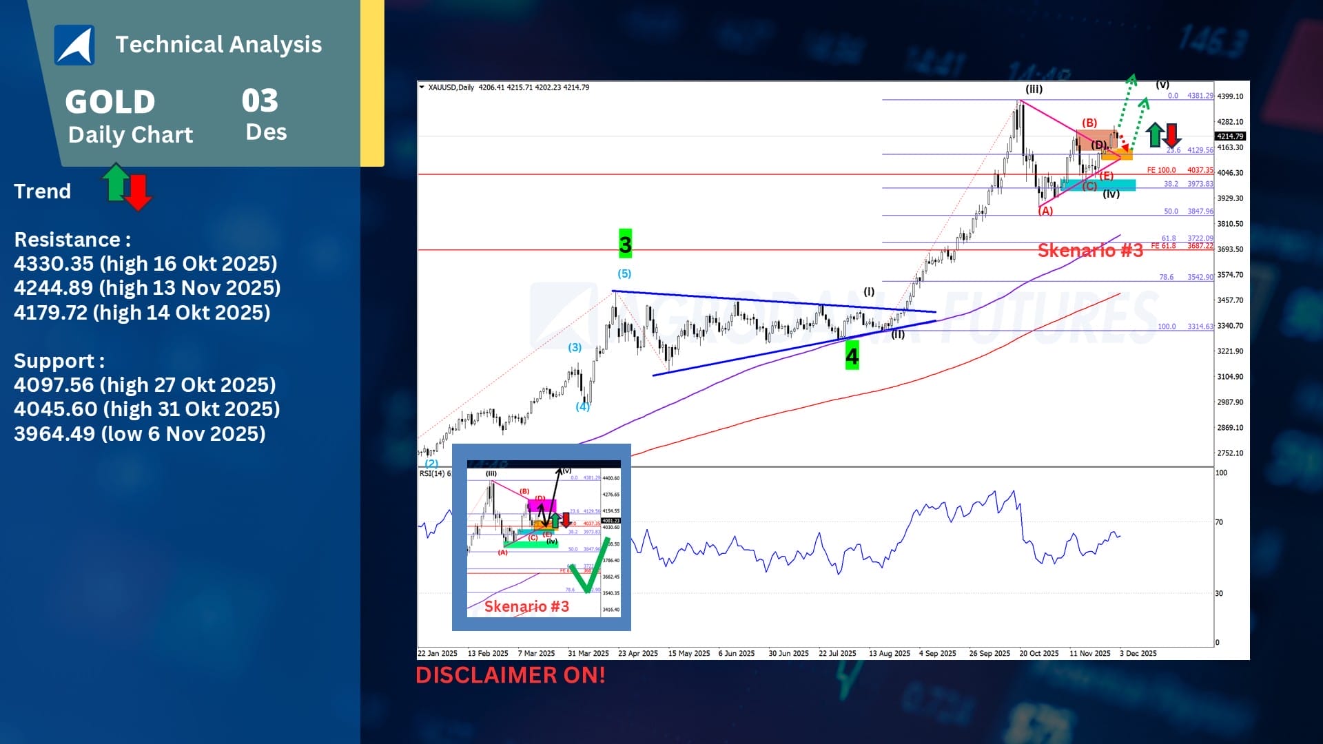 - a. Skenario #1 : skenario bullish, swing low kemungkinan mulai terbatas, zona biru tetap demand kuat, lanjut naik bertahap untuk wave 5 di atas 4264, lebih kuat jika data ADP maupun ISM lebih rendah dari ekspektasi -> buy tetap dominan