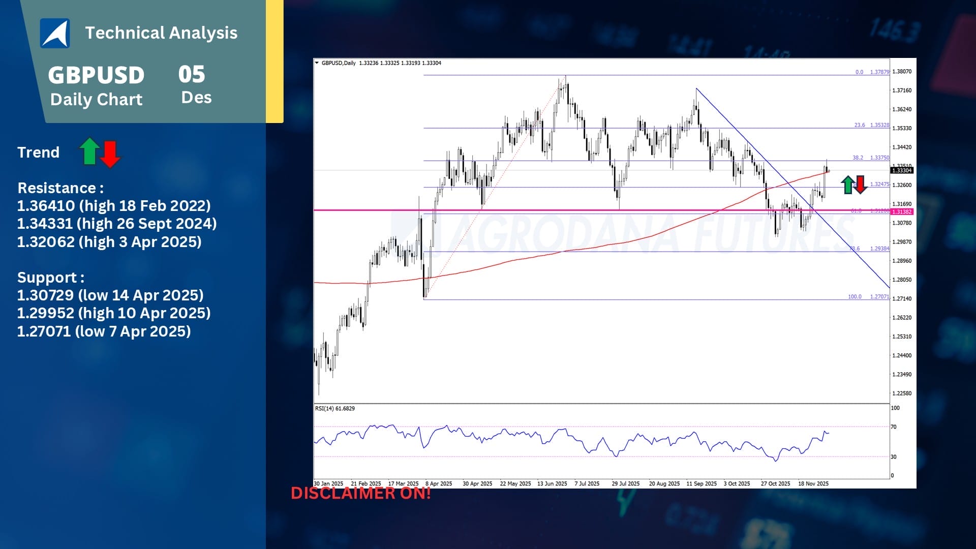 - Secara umum, peluang penurunan suku bunga BOE di Desember juga membebani GBP -> berpotensi batasi kenaikan