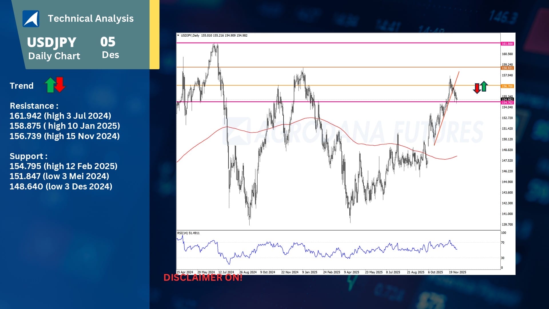 - Secara teknis, H4 pola descending broadening wedge masih berpeluang selama tidak ada penurunan di bawah 154.500, berarti masih ada peluang untuk usdjpy naik, terutama jika berhasil tembus resistance 155.700 -> tembus 155.800 berpeluang konfirm naik, sebaliknya jika turun di bawah 154.500 akan lanjut turun