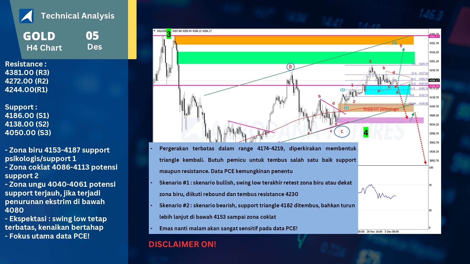 - a. Skenario #1 : skenario bullish, swing low terakhir retest zona biru atau dekat zona biru, diikuti rebound dan tembus resistance 4230 dan naik lebih lanjut -> buy tetap dominan, lebih kuat jika didukung data PCE yang lebih lemah atau minimal tidak berubah