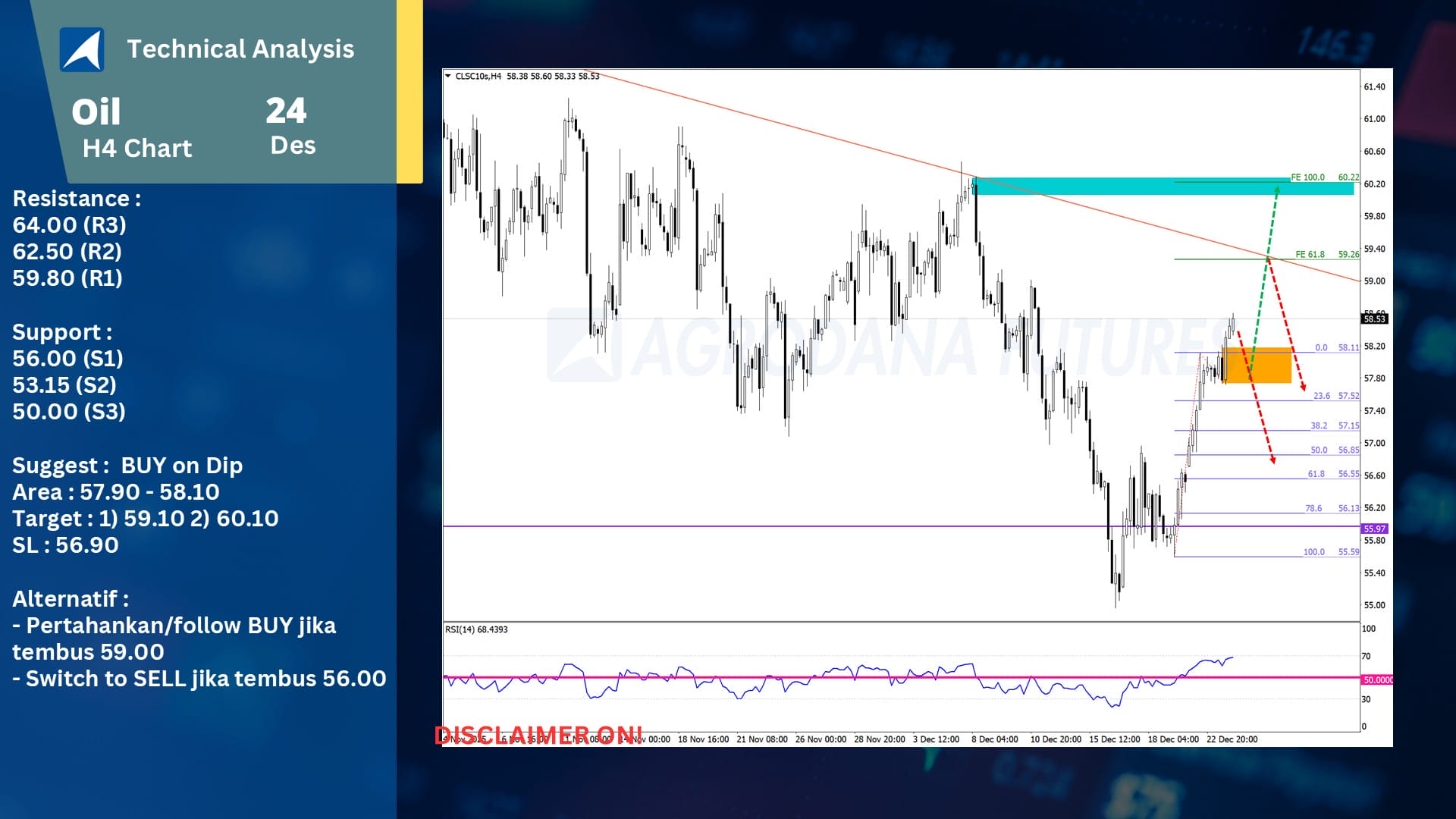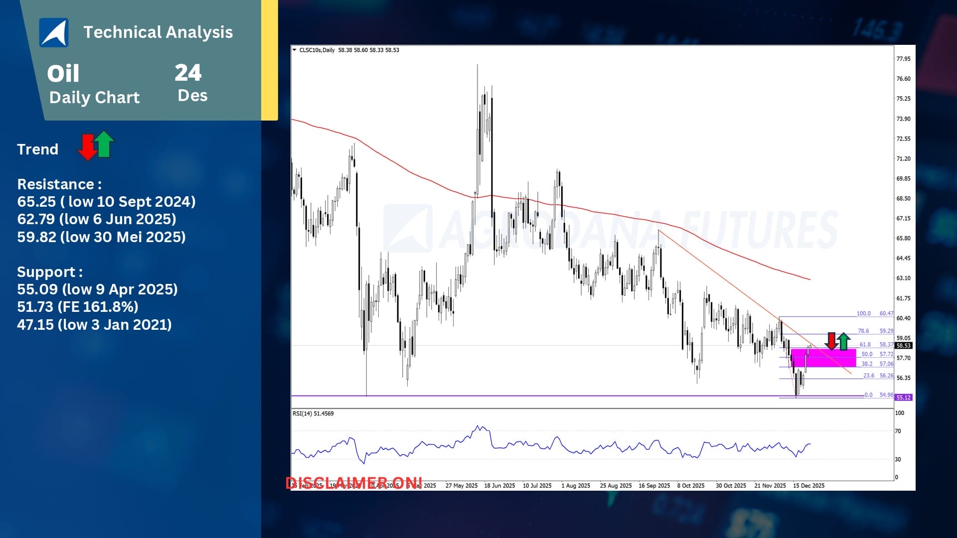 - Secara teknis, zona 58.60 di grafik daily saat ini resistance psikologis. Jika tidak tembus, waspadai pembalikan turun. Tapi koreksi turun diperkirakan terbatas karena kondisi geopolitik yang masih hangat