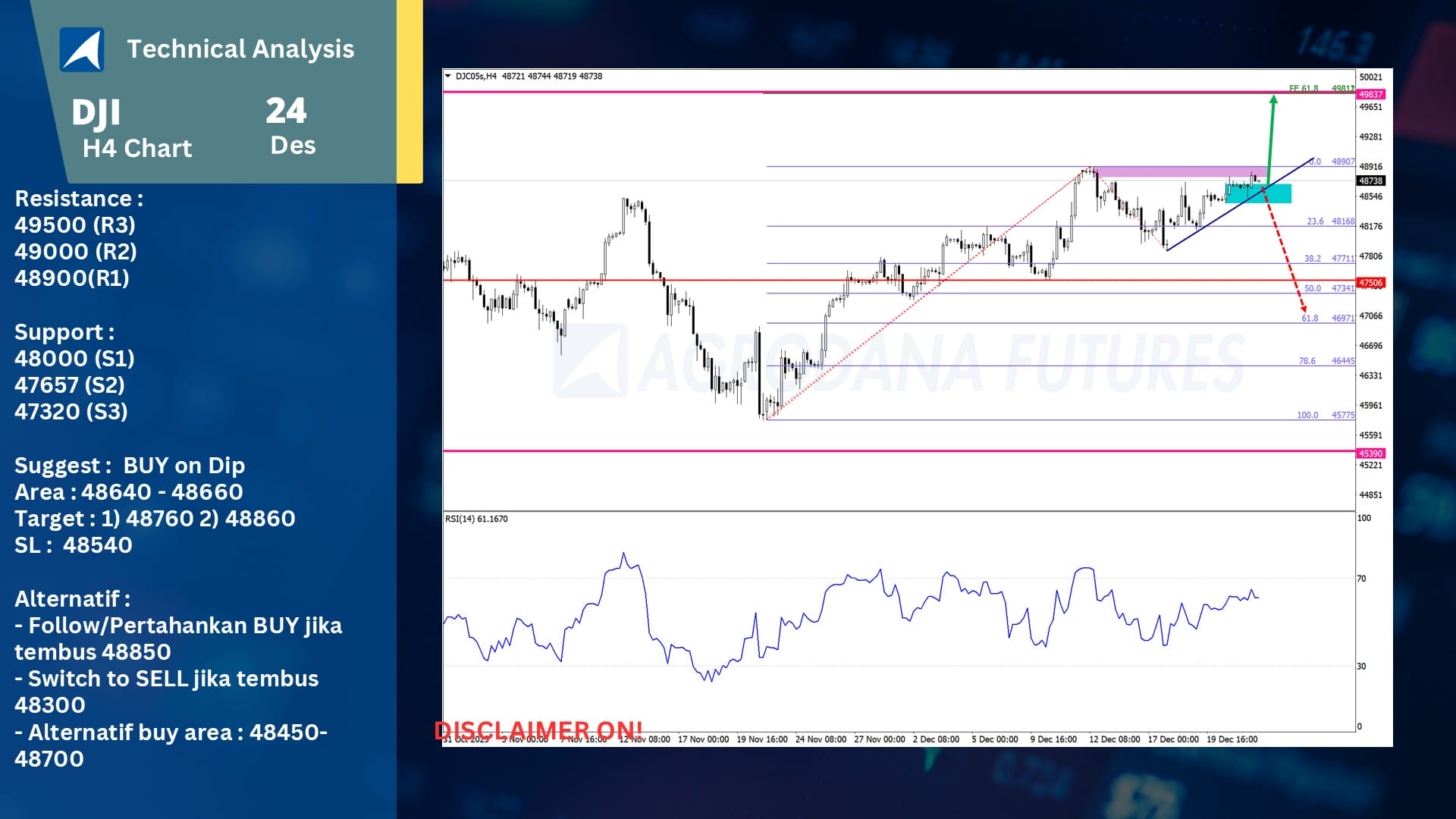| Suggest : BUY on Dip Area : 48640 - 48660 Target : 1) 48760 2) 48860 SL : 48540 Alternatif : - Follow/Pertahankan BUY jika tembus 48850 - Switch to SELL jika tembus 48300 - Alternatif buy area : 48450-48700 |