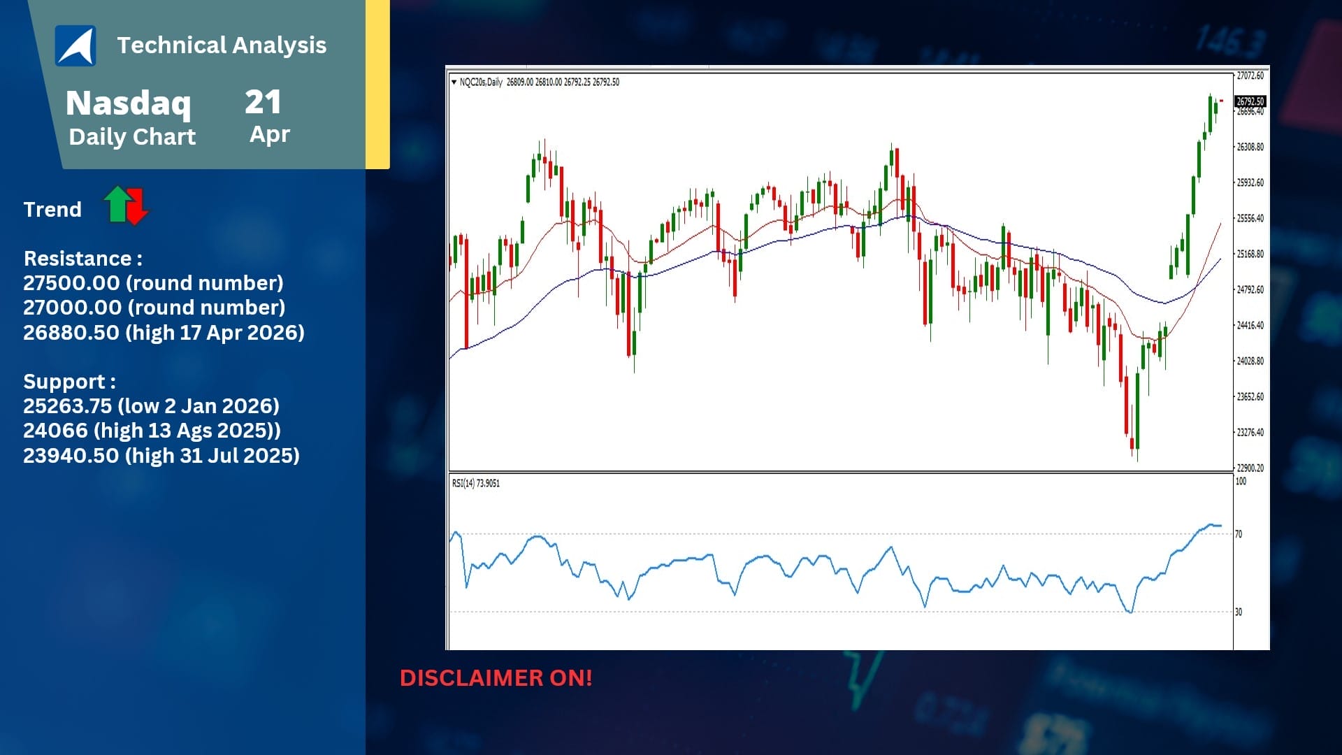 - Harga dibuka di 26809.00. EMA 20 (25507.00) tetap diatas EMA 50 (25130.00) di time frame daily, yang mengkonfirmasi bahwa momentum beli jangka menengah sedang menguasai. RSI(14) Daily menembus level 73.96, masuk zona overbought, waspadai koreksi sehat.