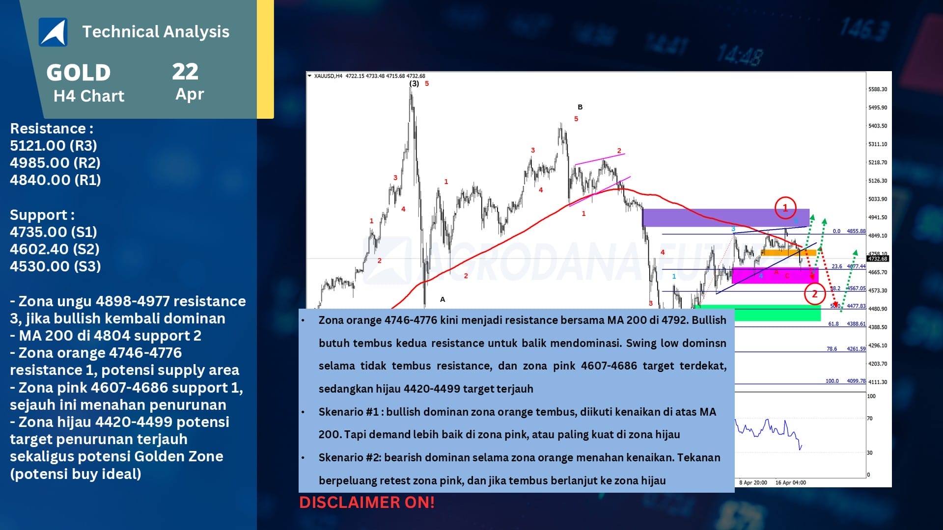 - Di H4, Zona orange 4746-4776 kini menjadi resistance bersama MA 200 di 4792. Bullish butuh tembus kedua resistance untuk balik mendominasi. Swing low dominsn selama tidak tembus resistance, dan zona pink 4607-4686 target terdekat, sedangkan hijau 4420-4499 target terjauh