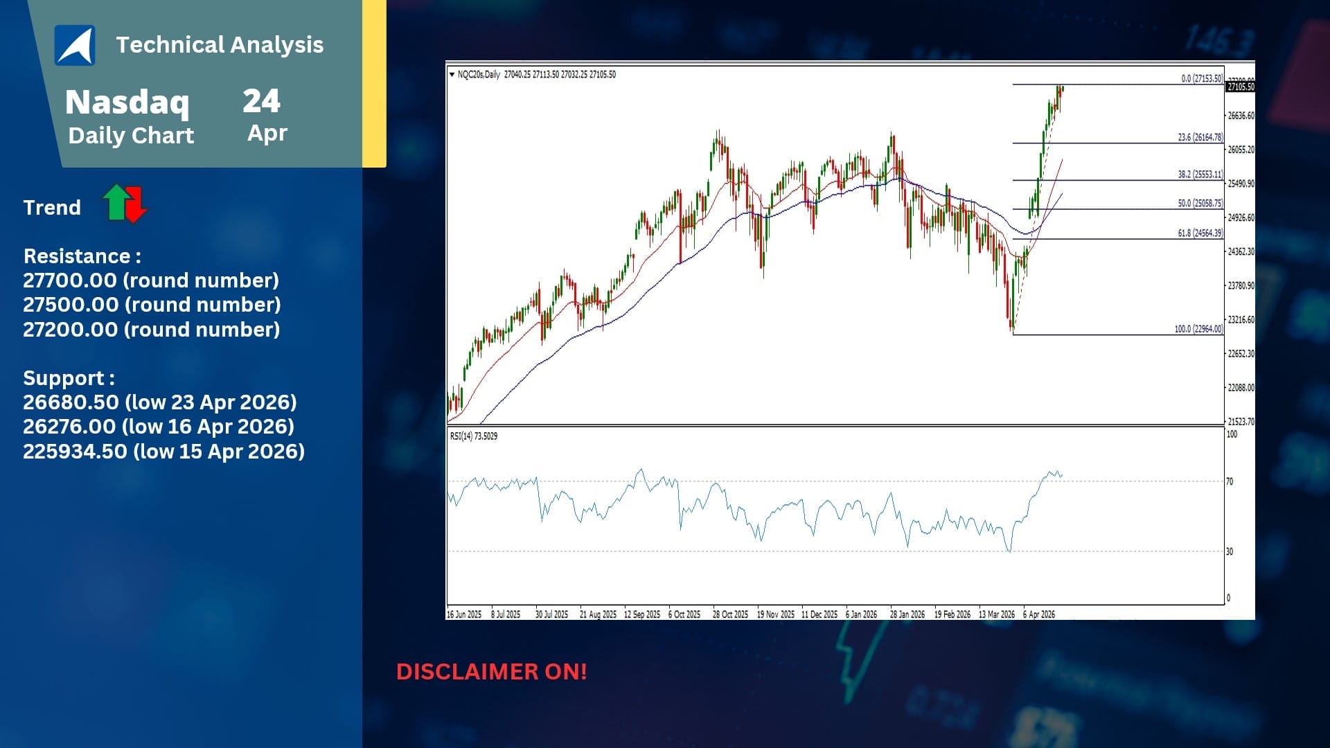 - Spillover Euforia Wall Street: S&P 500 dan Nasdaq baru saja mencetak rekor penutupan tertinggi baru didorong oleh rilis Earnings Season kuartal pertama yang solid. Nikkei cenderung positif.